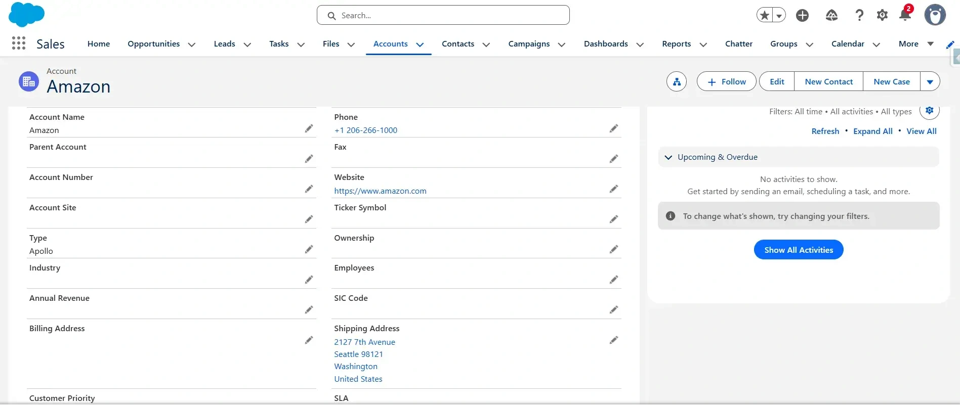 Click on the Amazon record on the Account object in your Salesforce Org. You will then see the detail page, where the value of the Type field is set to Apollo.