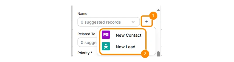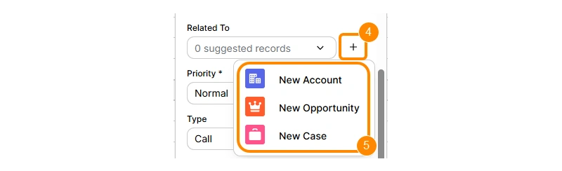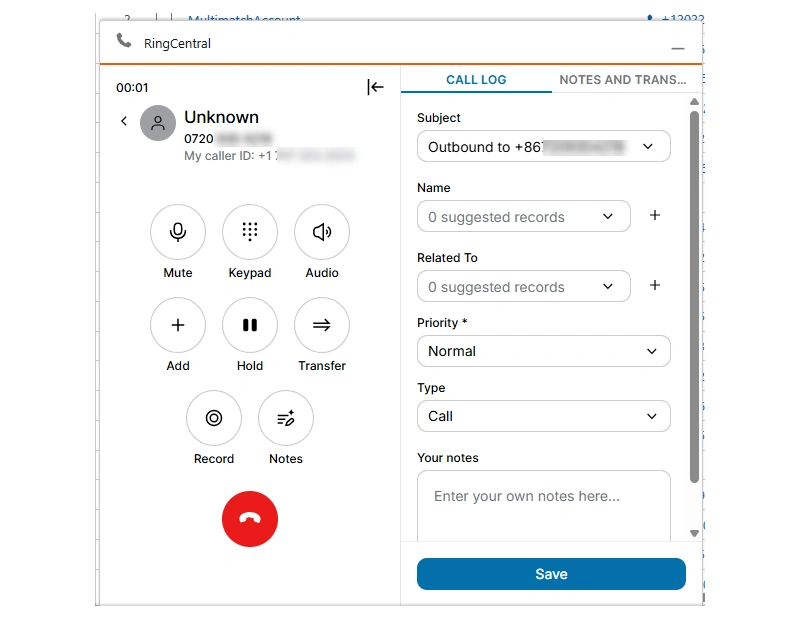 - When a call is made or received, the Call log window will automatically pop out, containing suggested records in the Name and Related To fields.