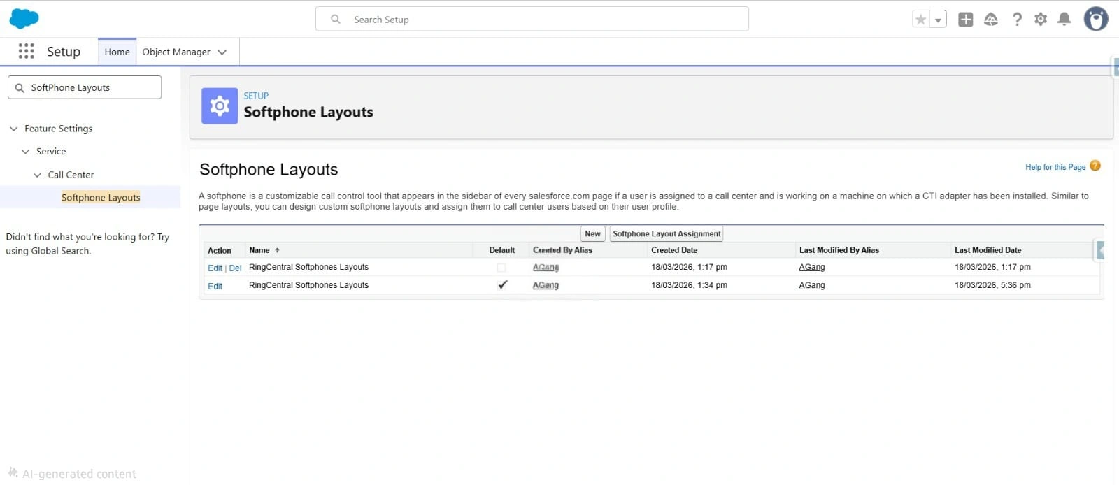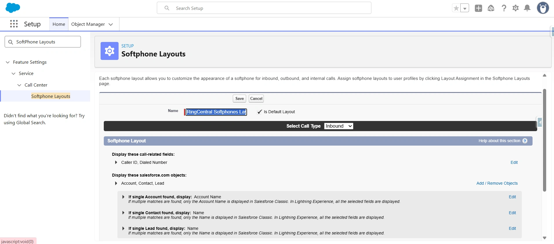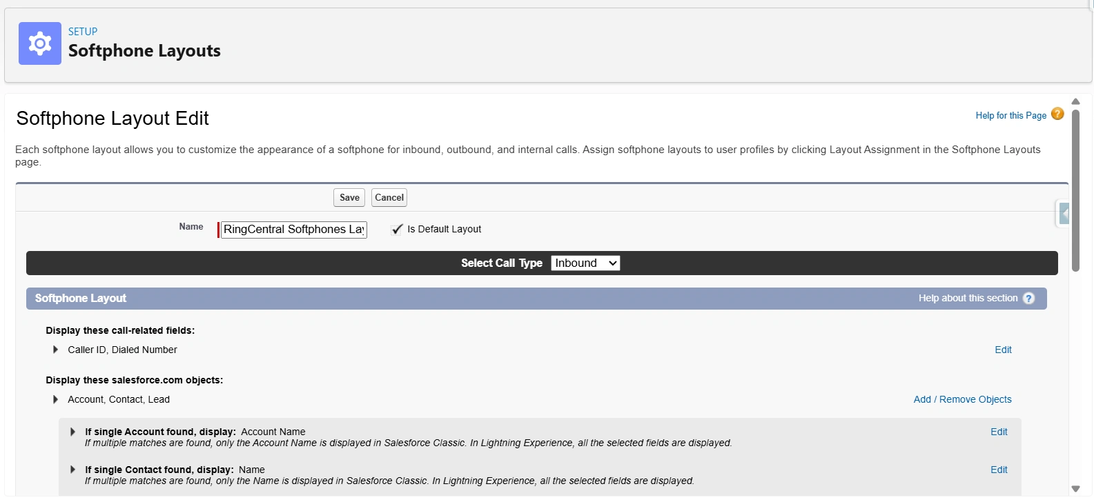 In the Name Field, fill the "RingCentral Softphones Layouts" and select the Is Default Layout checkbox if you want this layout to be the default for all users.