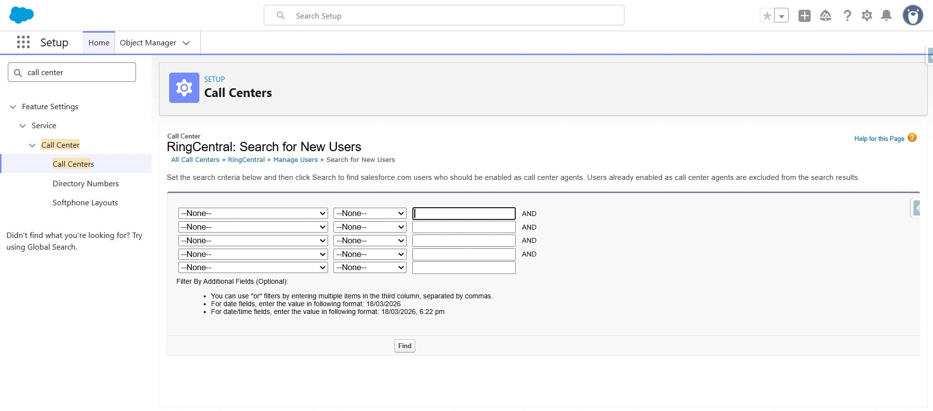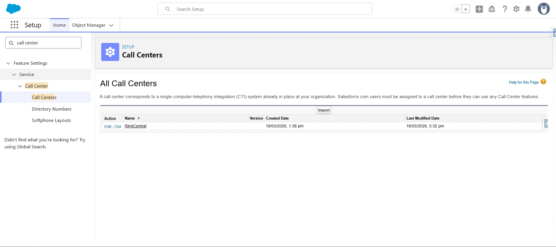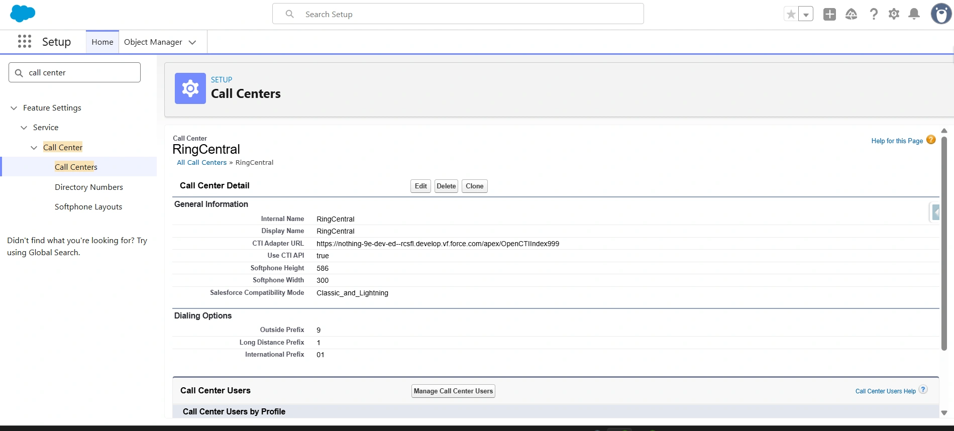 Select the call center and click on RingCentral. Please Note the name could be different say "RingCentral" depending on the salesforce version.