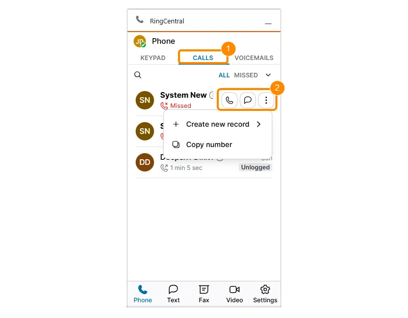Hover over a recent call. If the call was logged, you can click View in Salesforce arrow icon to review the record. Other options include: