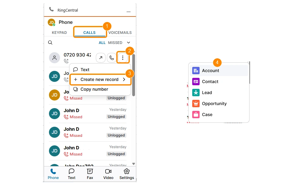 If the phone number matches a Salesforce record, those details will open when you select the phone number. If no match is found, you’ll have the option to create a new Salesforce record.